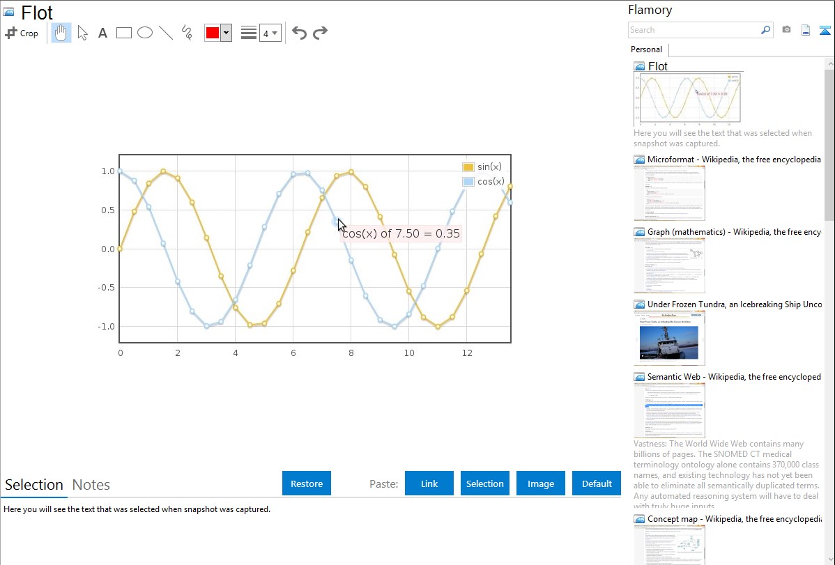 Flamory helps you capture and store screenshots from Flot by pressing a single hotkey. It will be saved to a history, so you can continue doing your tasks without interruptions. Later, you can edit the screenshot: crop, resize, add labels and highlights. After that, you can paste the screenshot into any other document or e-mail message.