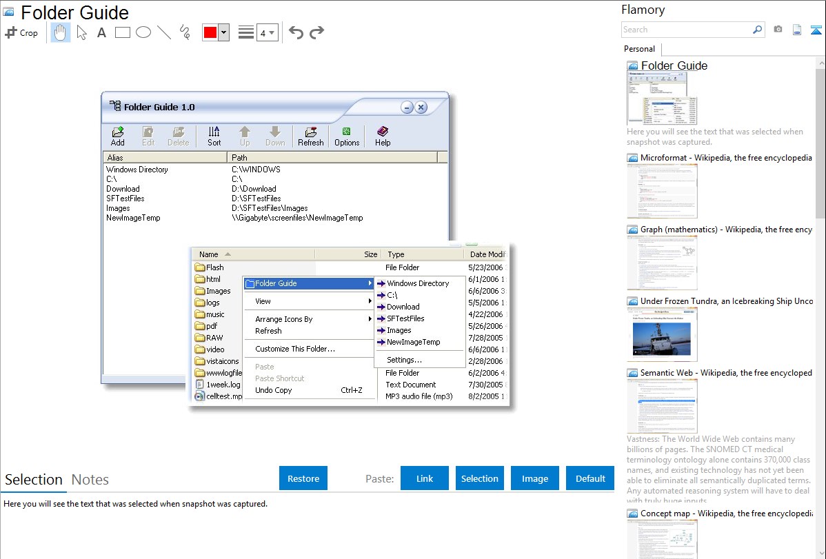 Flamory helps you capture and store screenshots from Folder Guide by pressing a single hotkey. It will be saved to a history, so you can continue doing your tasks without interruptions. Later, you can edit the screenshot: crop, resize, add labels and highlights. After that, you can paste the screenshot into any other document or e-mail message.