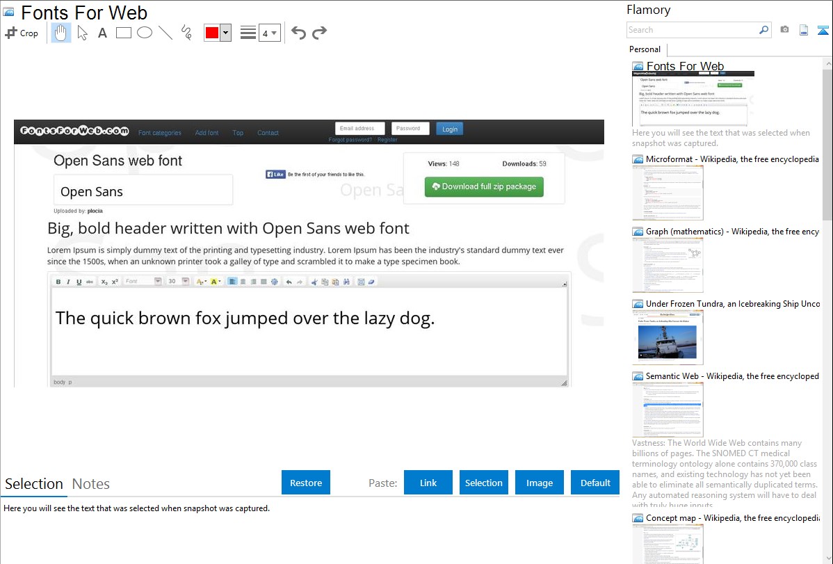Flamory helps you capture and store screenshots from Fonts For Web by pressing a single hotkey. It will be saved to a history, so you can continue doing your tasks without interruptions. Later, you can edit the screenshot: crop, resize, add labels and highlights. After that, you can paste the screenshot into any other document or e-mail message.