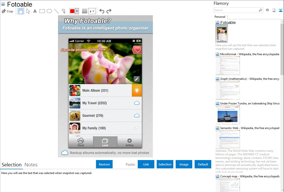 Flamory provides advanced bookmarking for Fotoable. It captures screen, selection, text on the page and other context. You can find this bookmark later using search by page content or looking through thumbnail list.