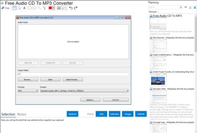 Flamory helps you capture and store screenshots from Free Audio CD To MP3 Converter by pressing a single hotkey. It will be saved to a history, so you can continue doing your tasks without interruptions. Later, you can edit the screenshot: crop, resize, add labels and highlights. After that, you can paste the screenshot into any other document or e-mail message.