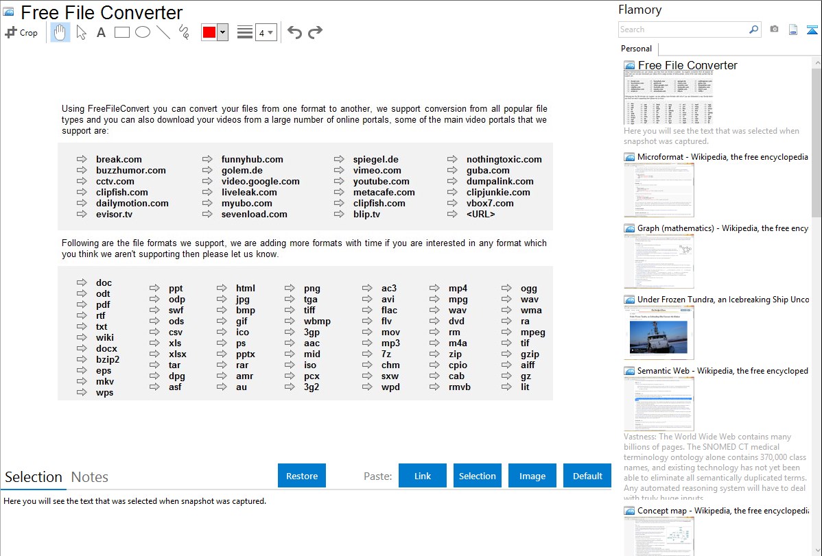 Flamory provides advanced bookmarking for Free File Converter. It captures screen, selection, text on the page and other context. You can find this bookmark later using search by page content or looking through thumbnail list.