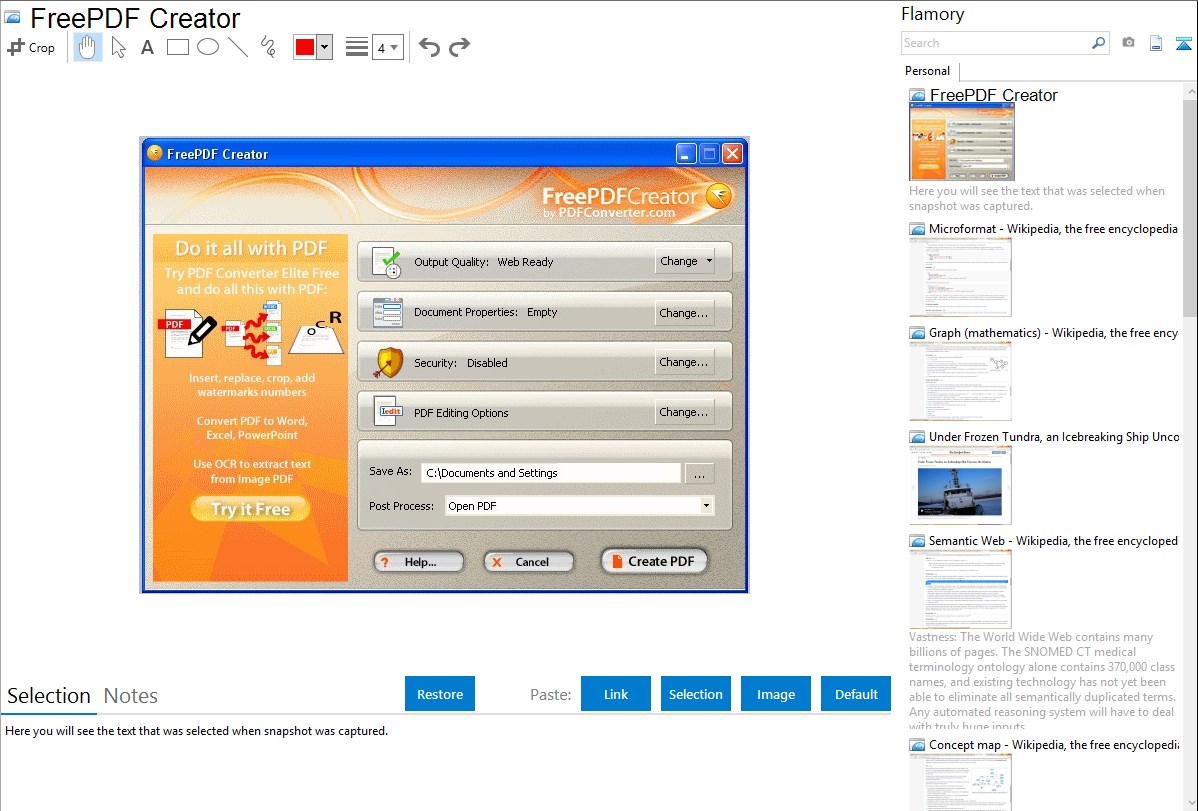 Flamory helps you capture and store screenshots from FreePDF Creator by pressing a single hotkey. It will be saved to a history, so you can continue doing your tasks without interruptions. Later, you can edit the screenshot: crop, resize, add labels and highlights. After that, you can paste the screenshot into any other document or e-mail message.