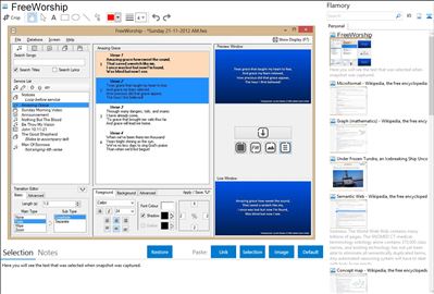 FreeWorship is a new versatile, easy-to-use, and reliable worship presentation software designed for churches, christian unions and worship sessions. Best of all FreeWorship is totally free. FreeWorship aims to offer as many features as possible while maintaining a simple interface for ease of use. It supports songs, bible verses, videos, images and soon it will support slides too. It uses smooth transitions and a simple style editor to make running a service easier and more professional than ever using only free software.
