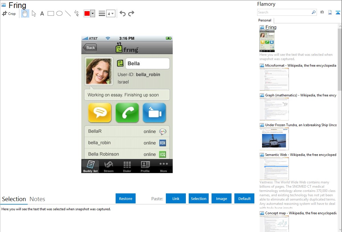 Flamory helps you capture and store screenshots from Fring by pressing a single hotkey. It will be saved to a history, so you can continue doing your tasks without interruptions. Later, you can edit the screenshot: crop, resize, add labels and highlights. After that, you can paste the screenshot into any other document or e-mail message.
