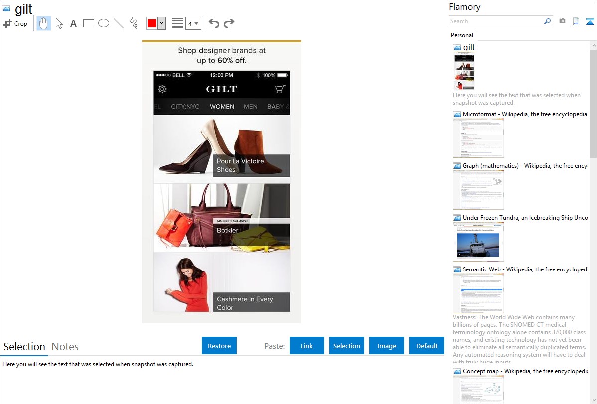 Flamory helps you capture and store screenshots from gilt by pressing a single hotkey. It will be saved to a history, so you can continue doing your tasks without interruptions. Later, you can edit the screenshot: crop, resize, add labels and highlights. After that, you can paste the screenshot into any other document or e-mail message.