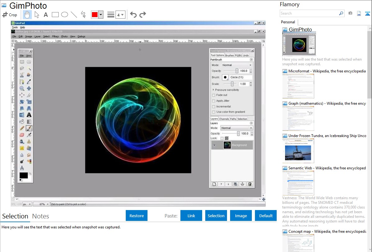 Flamory helps you capture and store screenshots from GimPhoto by pressing a single hotkey. It will be saved to a history, so you can continue doing your tasks without interruptions. Later, you can edit the screenshot: crop, resize, add labels and highlights. After that, you can paste the screenshot into any other document or e-mail message.