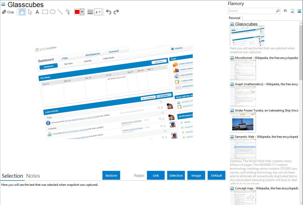 Flamory helps you capture and store screenshots from Glasscubes by pressing a single hotkey. It will be saved to a history, so you can continue doing your tasks without interruptions. Later, you can edit the screenshot: crop, resize, add labels and highlights. After that, you can paste the screenshot into any other document or e-mail message.