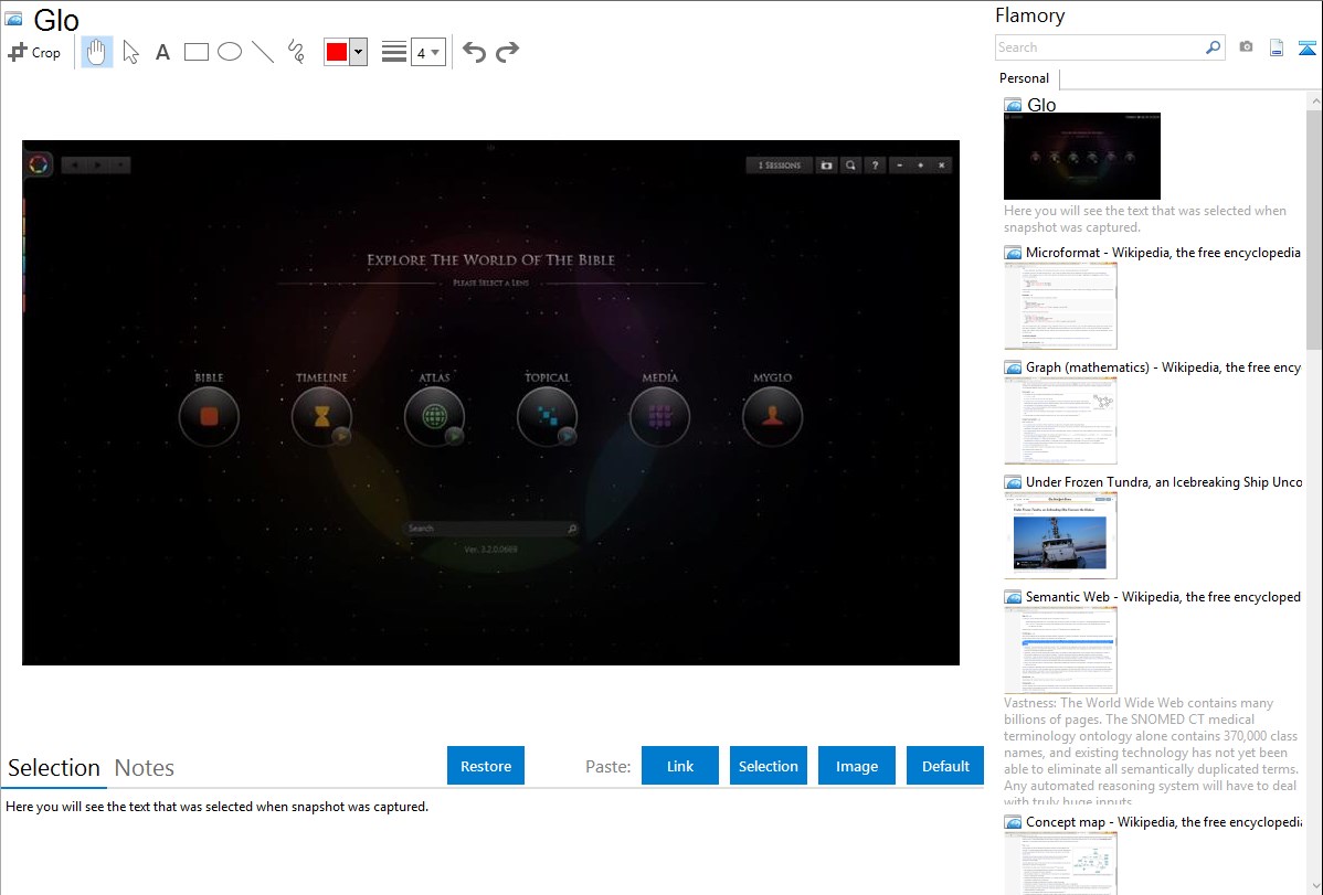 Flamory helps you capture and store screenshots from Glo by pressing a single hotkey. It will be saved to a history, so you can continue doing your tasks without interruptions. Later, you can edit the screenshot: crop, resize, add labels and highlights. After that, you can paste the screenshot into any other document or e-mail message.