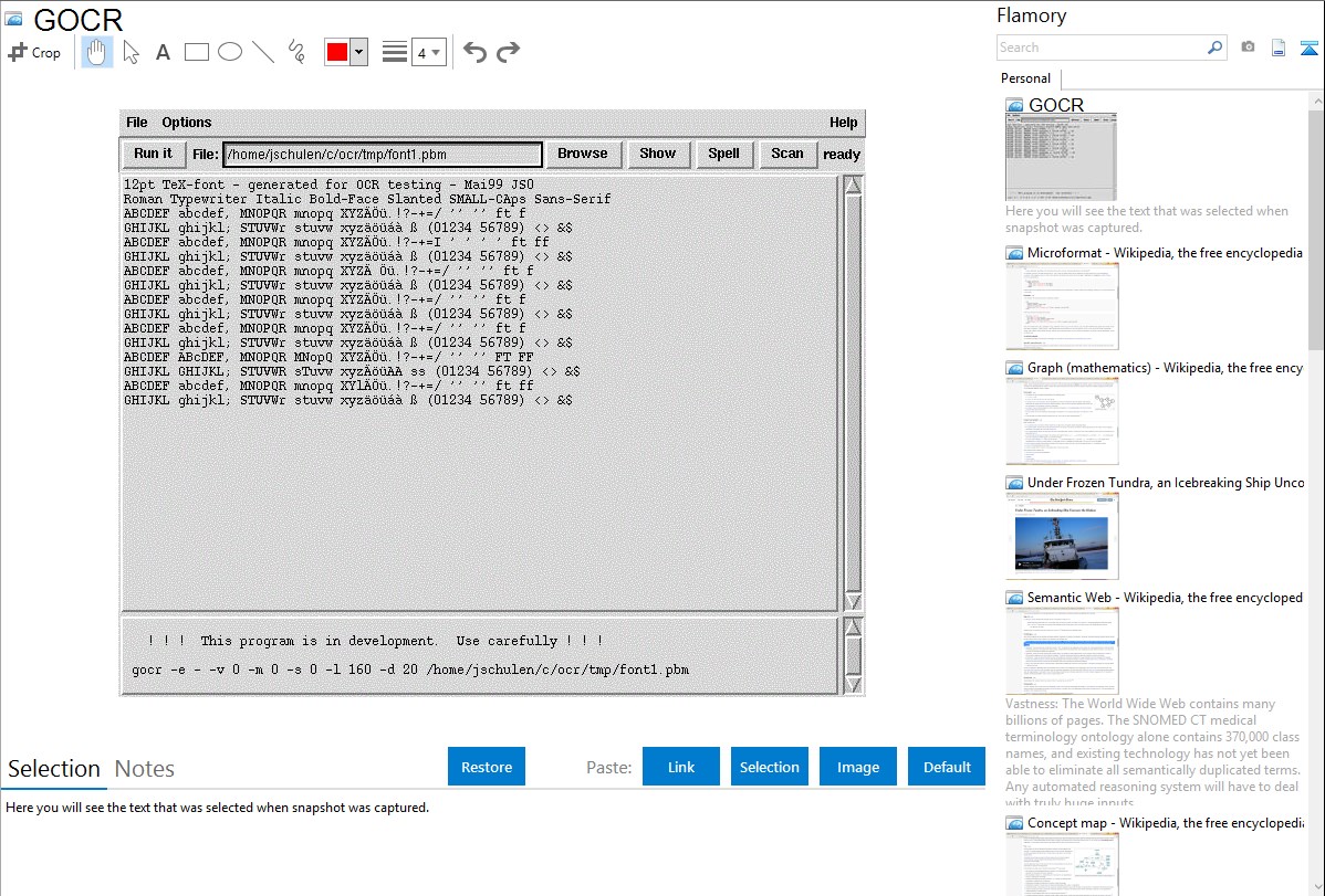 Flamory helps you capture and store screenshots from GOCR by pressing a single hotkey. It will be saved to a history, so you can continue doing your tasks without interruptions. Later, you can edit the screenshot: crop, resize, add labels and highlights. After that, you can paste the screenshot into any other document or e-mail message.