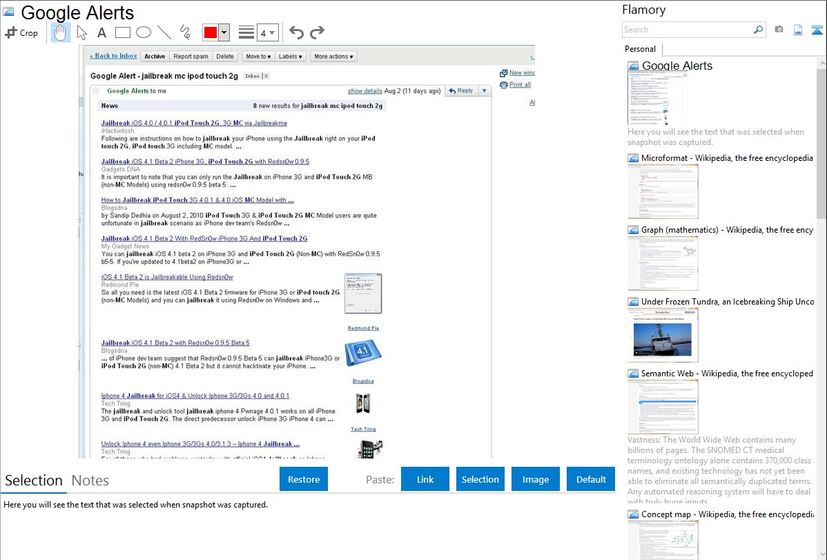 Flamory helps you capture and store screenshots from Google Alerts by pressing a single hotkey. It will be saved to a history, so you can continue doing your tasks without interruptions. Later, you can edit the screenshot: crop, resize, add labels and highlights. After that, you can paste the screenshot into any other document or e-mail message.