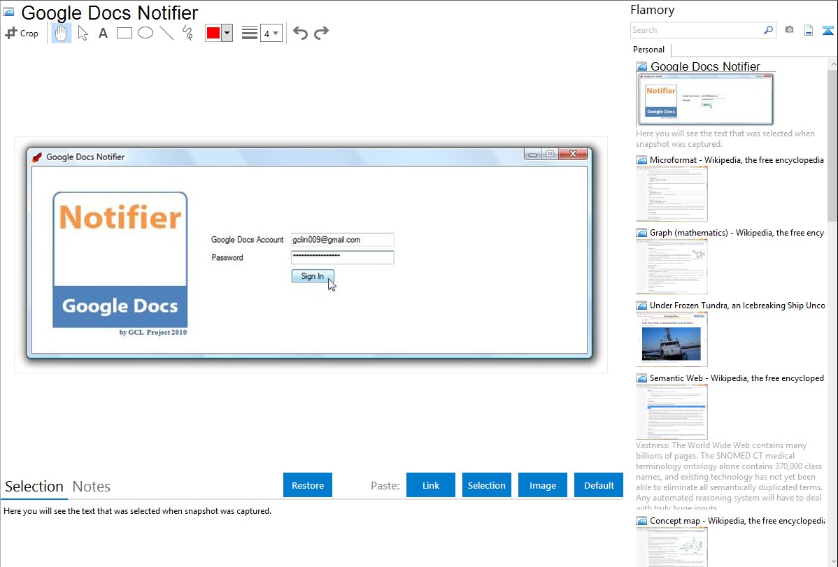 Flamory helps you capture and store screenshots from Google Docs Notifier by pressing a single hotkey. It will be saved to a history, so you can continue doing your tasks without interruptions. Later, you can edit the screenshot: crop, resize, add labels and highlights. After that, you can paste the screenshot into any other document or e-mail message.
