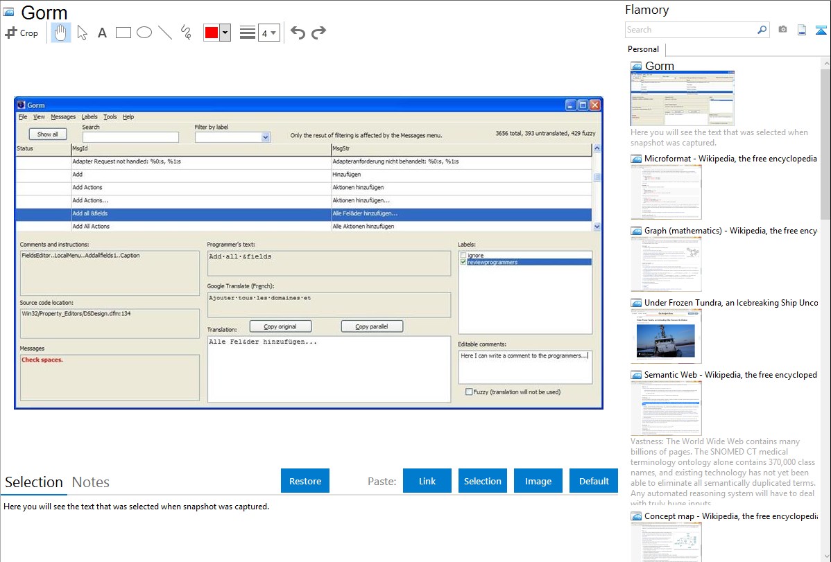 Flamory helps you capture and store screenshots from Gorm by pressing a single hotkey. It will be saved to a history, so you can continue doing your tasks without interruptions. Later, you can edit the screenshot: crop, resize, add labels and highlights. After that, you can paste the screenshot into any other document or e-mail message.