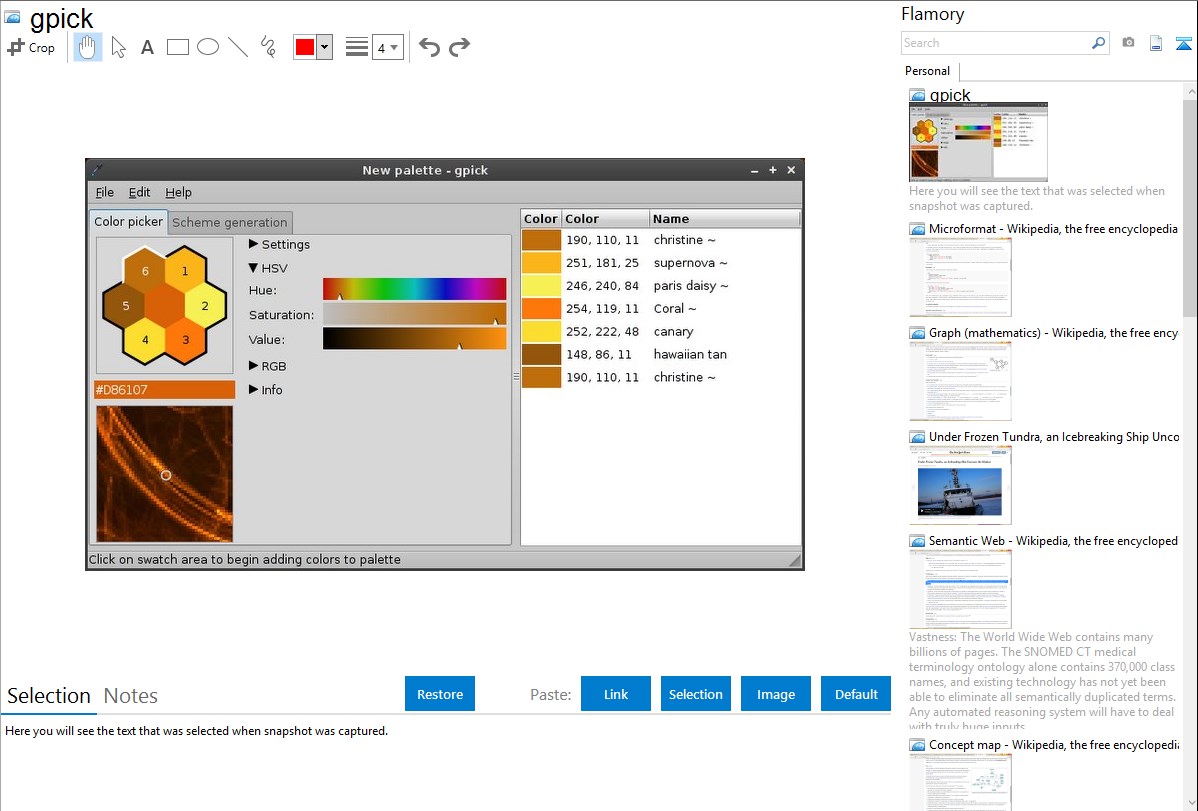 Flamory helps you capture and store screenshots from gpick by pressing a single hotkey. It will be saved to a history, so you can continue doing your tasks without interruptions. Later, you can edit the screenshot: crop, resize, add labels and highlights. After that, you can paste the screenshot into any other document or e-mail message.