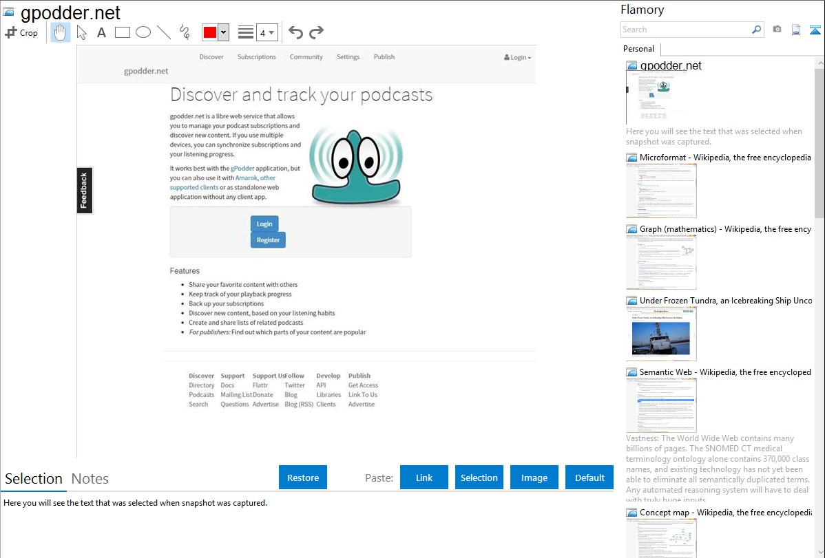 Flamory helps you capture and store screenshots from gpodder.net by pressing a single hotkey. It will be saved to a history, so you can continue doing your tasks without interruptions. Later, you can edit the screenshot: crop, resize, add labels and highlights. After that, you can paste the screenshot into any other document or e-mail message.