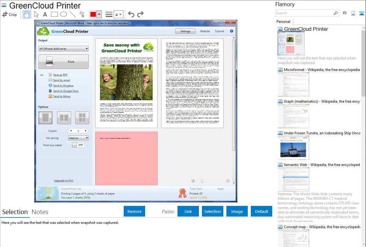 Flamory helps you capture and store screenshots from GreenCloud Printer by pressing a single hotkey. It will be saved to a history, so you can continue doing your tasks without interruptions. Later, you can edit the screenshot: crop, resize, add labels and highlights. After that, you can paste the screenshot into any other document or e-mail message.