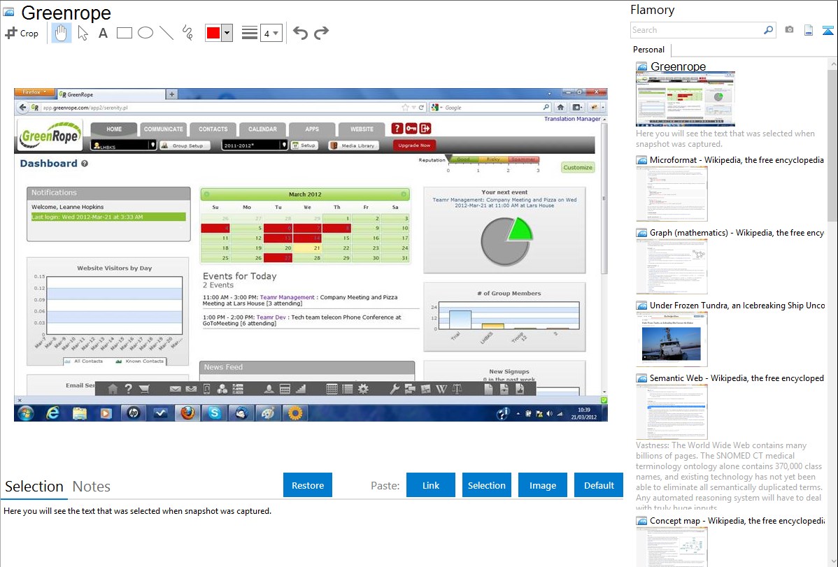 Flamory helps you capture and store screenshots from Greenrope by pressing a single hotkey. It will be saved to a history, so you can continue doing your tasks without interruptions. Later, you can edit the screenshot: crop, resize, add labels and highlights. After that, you can paste the screenshot into any other document or e-mail message.