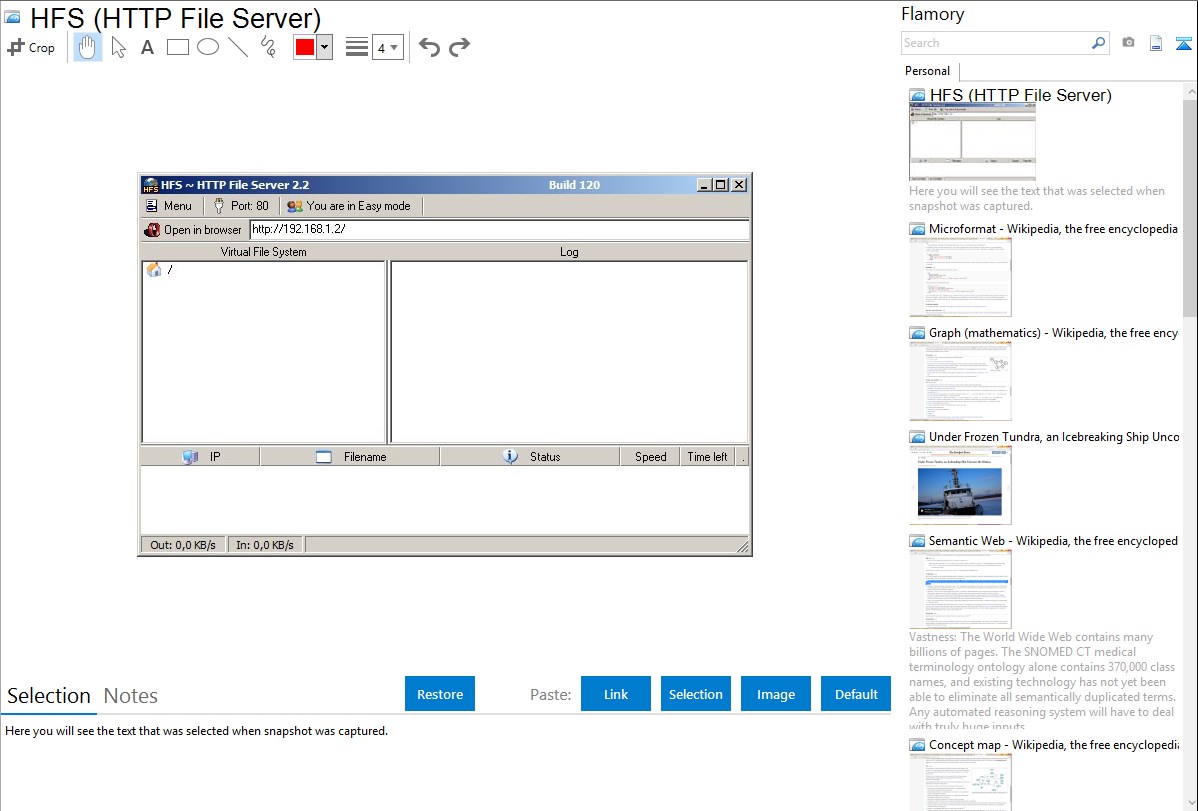 Flamory helps you capture and store screenshots from HFS (HTTP File Server) by pressing a single hotkey. It will be saved to a history, so you can continue doing your tasks without interruptions. Later, you can edit the screenshot: crop, resize, add labels and highlights. After that, you can paste the screenshot into any other document or e-mail message.