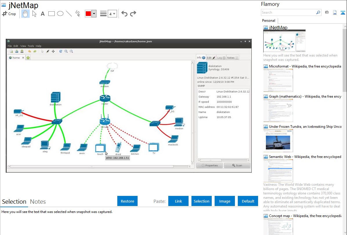Flamory helps you capture and store screenshots from jNetMap by pressing a single hotkey. It will be saved to a history, so you can continue doing your tasks without interruptions. Later, you can edit the screenshot: crop, resize, add labels and highlights. After that, you can paste the screenshot into any other document or e-mail message.