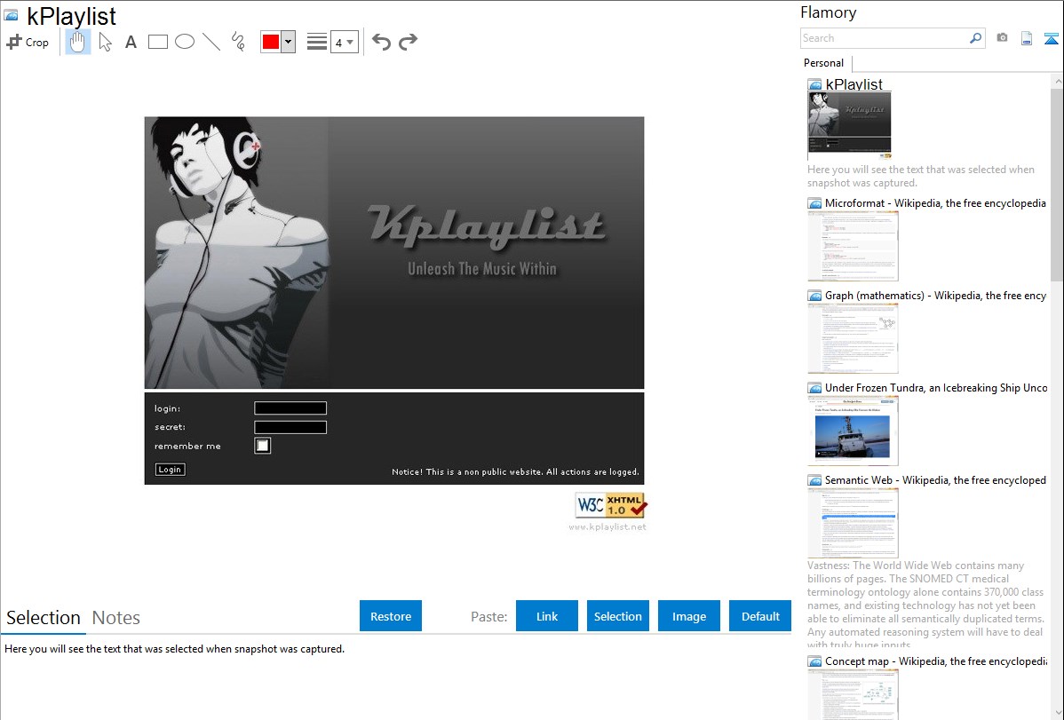 Flamory helps you capture and store screenshots from kPlaylist by pressing a single hotkey. It will be saved to a history, so you can continue doing your tasks without interruptions. Later, you can edit the screenshot: crop, resize, add labels and highlights. After that, you can paste the screenshot into any other document or e-mail message.