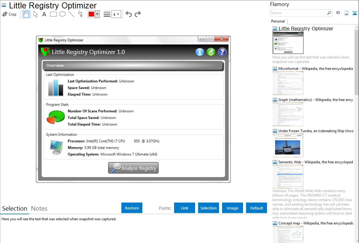Flamory helps you capture and store screenshots from Little Registry Optimizer by pressing a single hotkey. It will be saved to a history, so you can continue doing your tasks without interruptions. Later, you can edit the screenshot: crop, resize, add labels and highlights. After that, you can paste the screenshot into any other document or e-mail message.