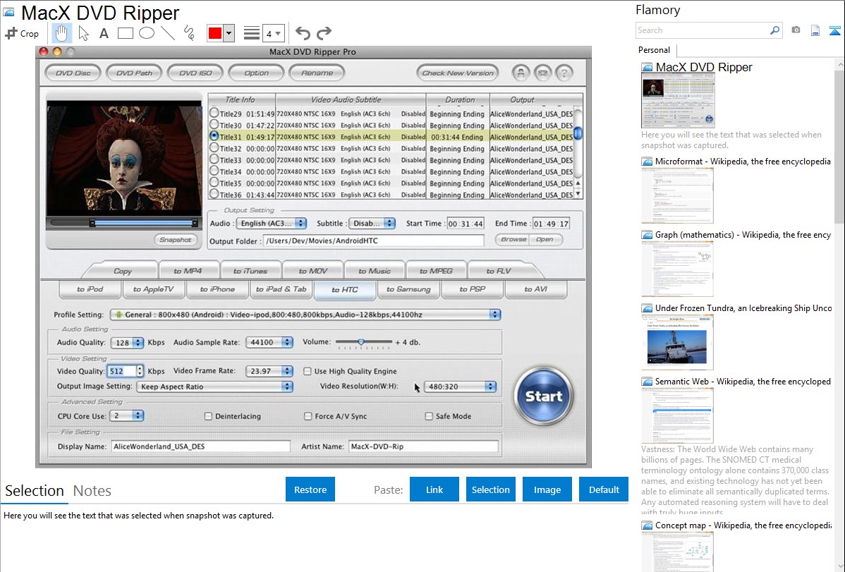 Flamory helps you capture and store screenshots from MacX DVD Ripper by pressing a single hotkey. It will be saved to a history, so you can continue doing your tasks without interruptions. Later, you can edit the screenshot: crop, resize, add labels and highlights. After that, you can paste the screenshot into any other document or e-mail message.