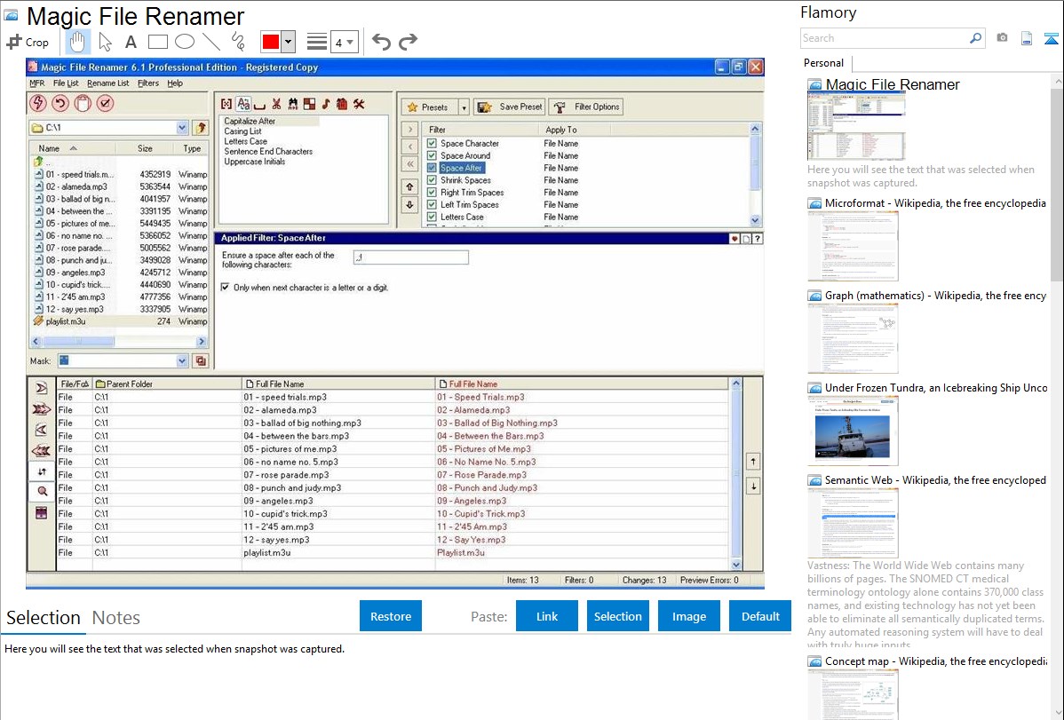 Flamory provides advanced bookmarking for Magic File Renamer. It captures screen, selection, text of the document and other context. You can find this bookmark later using search by document content or looking through thumbnail list.