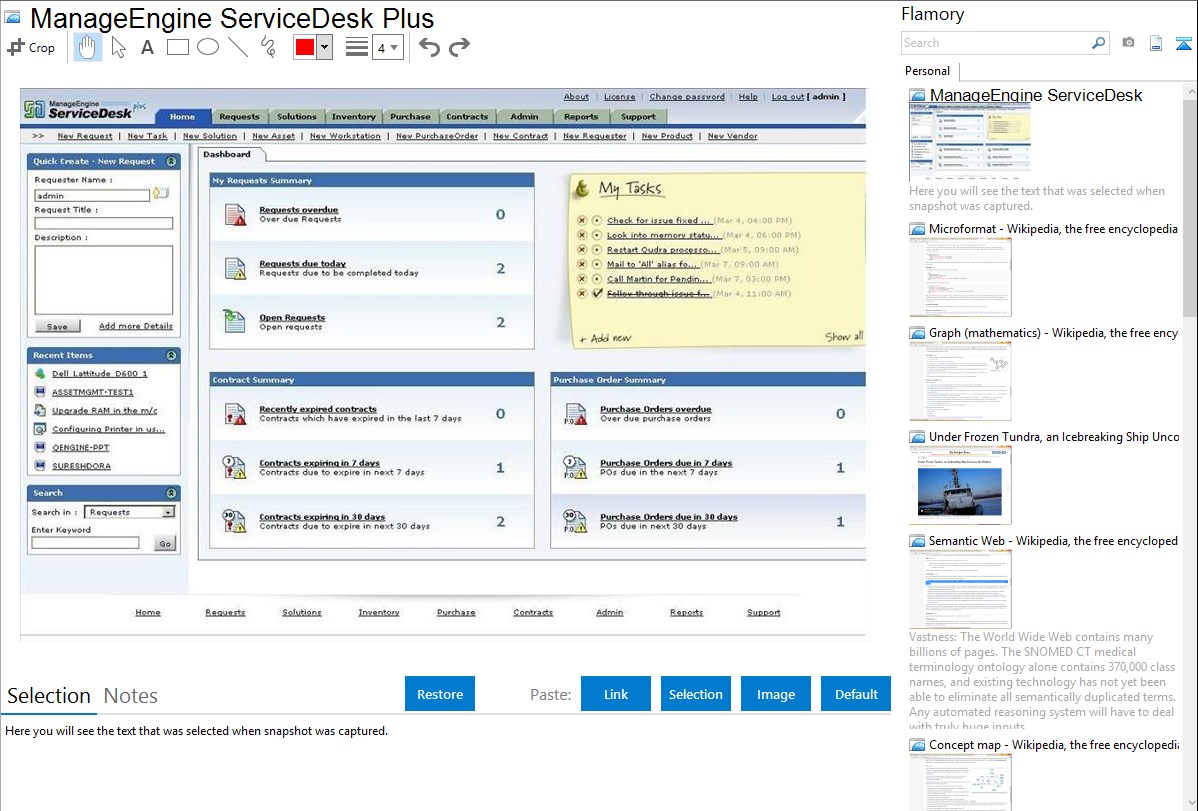 Flamory helps you capture and store screenshots from ManageEngine ServiceDesk Plus by pressing a single hotkey. It will be saved to a history, so you can continue doing your tasks without interruptions. Later, you can edit the screenshot: crop, resize, add labels and highlights. After that, you can paste the screenshot into any other document or e-mail message.