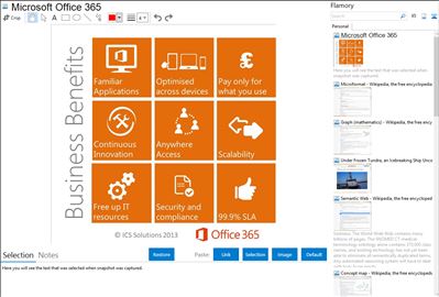 Flamory helps you capture and store screenshots from Microsoft Office 365 by pressing a single hotkey. It will be saved to a history, so you can continue doing your tasks without interruptions. Later, you can edit the screenshot: crop, resize, add labels and highlights. After that, you can paste the screenshot into any other document or e-mail message.