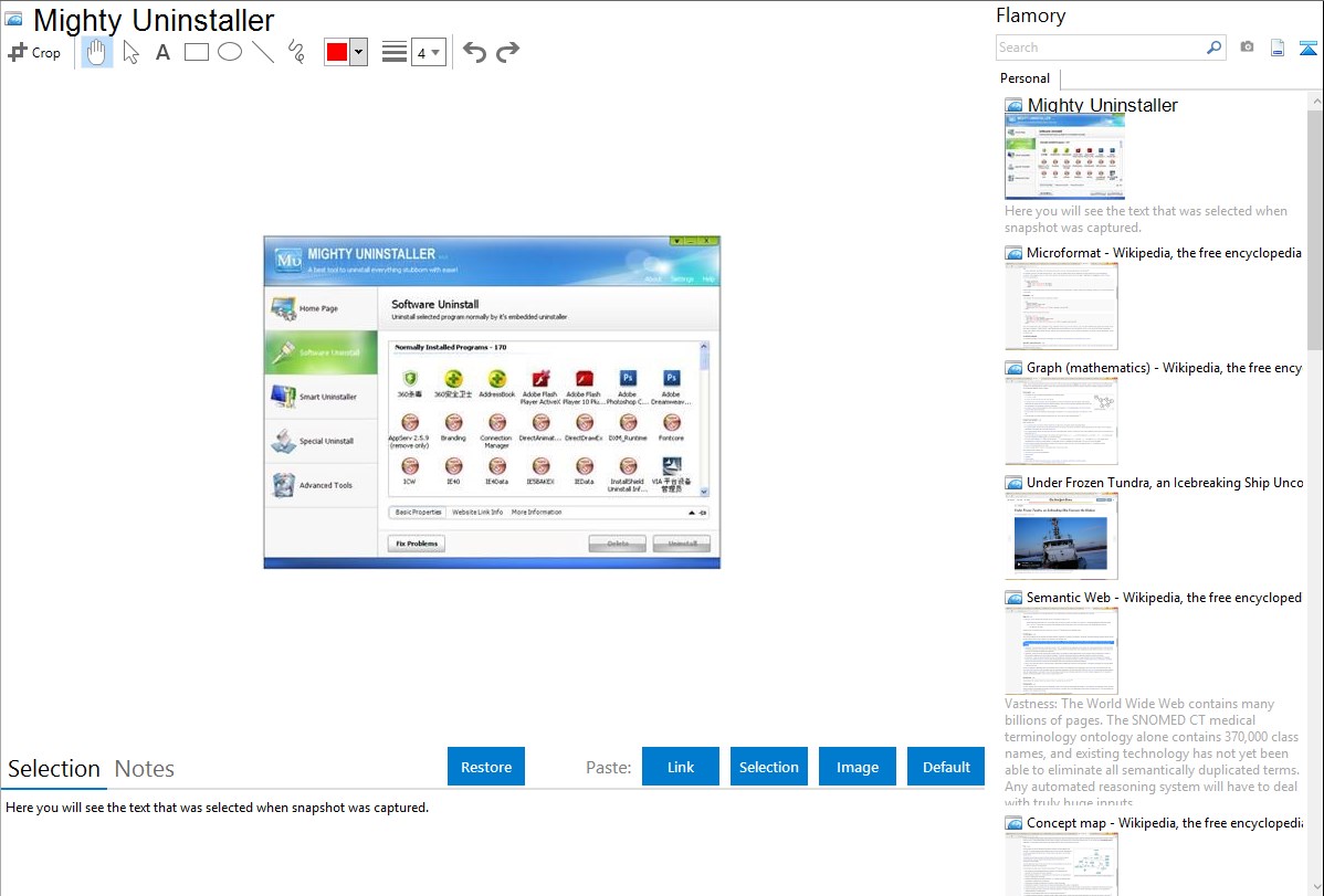 Flamory helps you capture and store screenshots from Mighty Uninstaller by pressing a single hotkey. It will be saved to a history, so you can continue doing your tasks without interruptions. Later, you can edit the screenshot: crop, resize, add labels and highlights. After that, you can paste the screenshot into any other document or e-mail message.