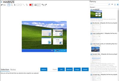 Flamory helps you capture and store screenshots from miniMIZE by pressing a single hotkey. It will be saved to a history, so you can continue doing your tasks without interruptions. Later, you can edit the screenshot: crop, resize, add labels and highlights. After that, you can paste the screenshot into any other document or e-mail message.