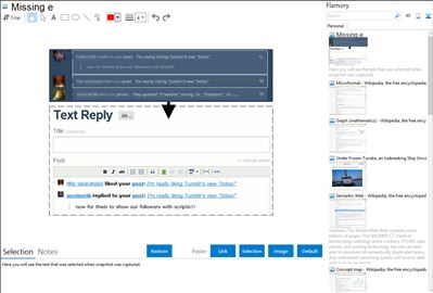 Flamory helps you capture and store screenshots from Missing e by pressing a single hotkey. It will be saved to a history, so you can continue doing your tasks without interruptions. Later, you can edit the screenshot: crop, resize, add labels and highlights. After that, you can paste the screenshot into any other document or e-mail message.