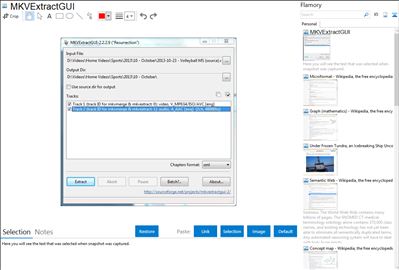 Flamory provides advanced bookmarking for MKVExtractGUI. It captures screen, selection, text of the document and other context. You can find this bookmark later using search by document content or looking through thumbnail list.