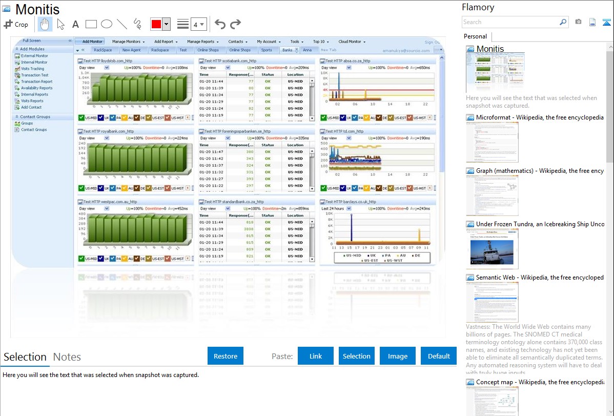 Flamory helps you capture and store screenshots from Monitis by pressing a single hotkey. It will be saved to a history, so you can continue doing your tasks without interruptions. Later, you can edit the screenshot: crop, resize, add labels and highlights. After that, you can paste the screenshot into any other document or e-mail message.