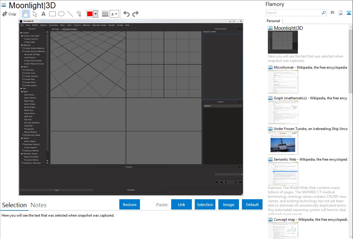 Flamory helps you capture and store screenshots from Moonlight|3D by pressing a single hotkey. It will be saved to a history, so you can continue doing your tasks without interruptions. Later, you can edit the screenshot: crop, resize, add labels and highlights. After that, you can paste the screenshot into any other document or e-mail message.