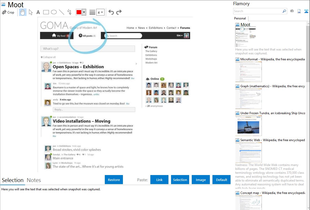 Flamory helps you capture and store screenshots from Moot by pressing a single hotkey. It will be saved to a history, so you can continue doing your tasks without interruptions. Later, you can edit the screenshot: crop, resize, add labels and highlights. After that, you can paste the screenshot into any other document or e-mail message.