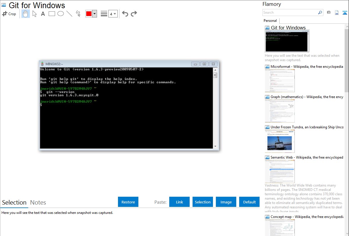 Flamory helps you capture and store screenshots from Git for Windows by pressing a single hotkey. It will be saved to a history, so you can continue doing your tasks without interruptions. Later, you can edit the screenshot: crop, resize, add labels and highlights. After that, you can paste the screenshot into any other document or e-mail message.