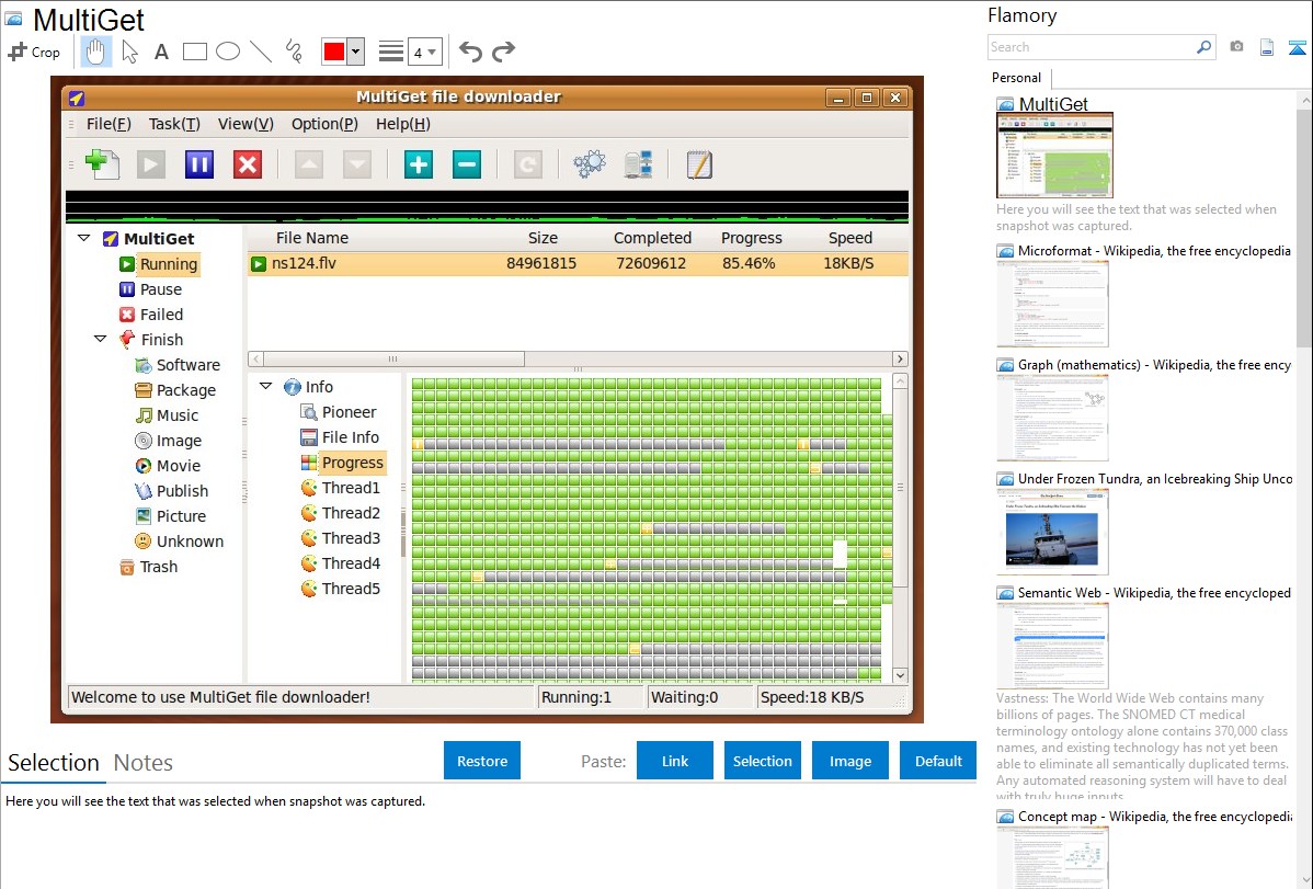 Flamory helps you capture and store screenshots from MultiGet by pressing a single hotkey. It will be saved to a history, so you can continue doing your tasks without interruptions. Later, you can edit the screenshot: crop, resize, add labels and highlights. After that, you can paste the screenshot into any other document or e-mail message.