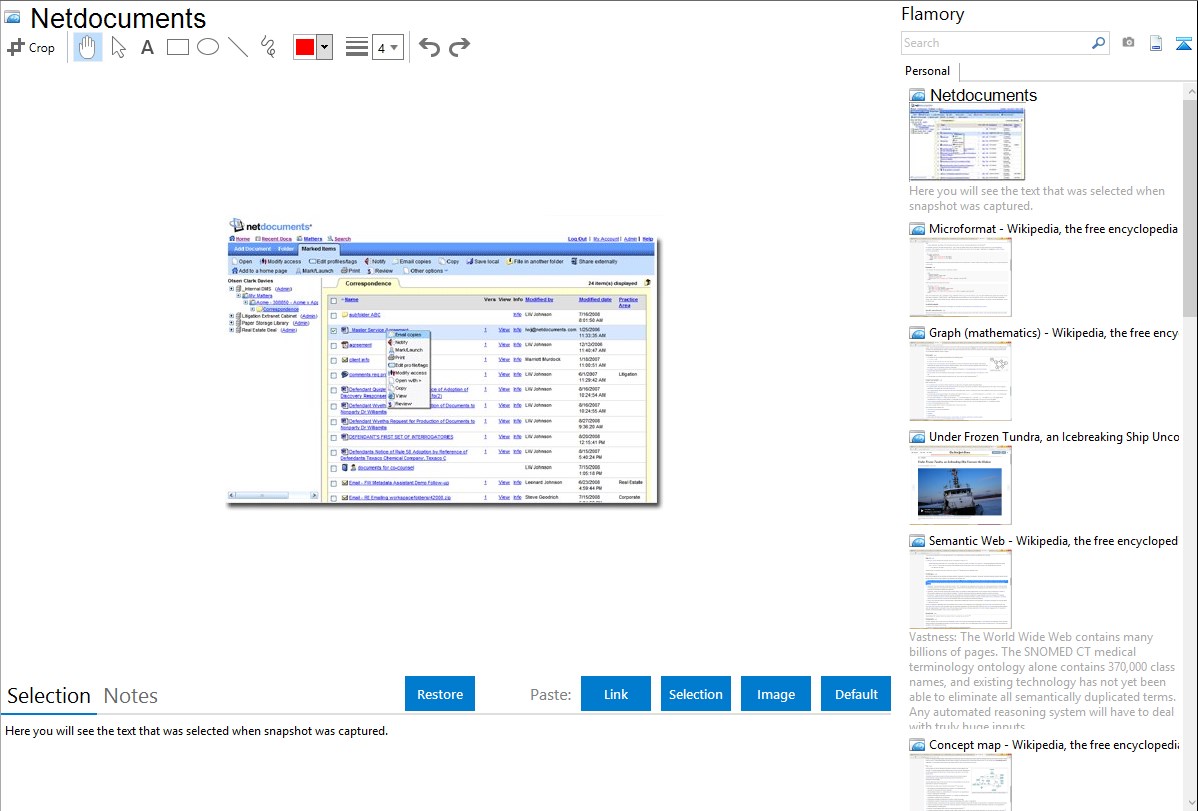 Flamory helps you capture and store screenshots from Netdocuments by pressing a single hotkey. It will be saved to a history, so you can continue doing your tasks without interruptions. Later, you can edit the screenshot: crop, resize, add labels and highlights. After that, you can paste the screenshot into any other document or e-mail message.