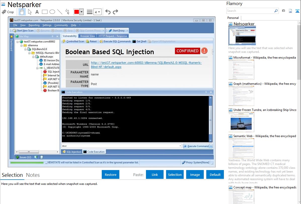 Flamory helps you capture and store screenshots from Netsparker by pressing a single hotkey. It will be saved to a history, so you can continue doing your tasks without interruptions. Later, you can edit the screenshot: crop, resize, add labels and highlights. After that, you can paste the screenshot into any other document or e-mail message.