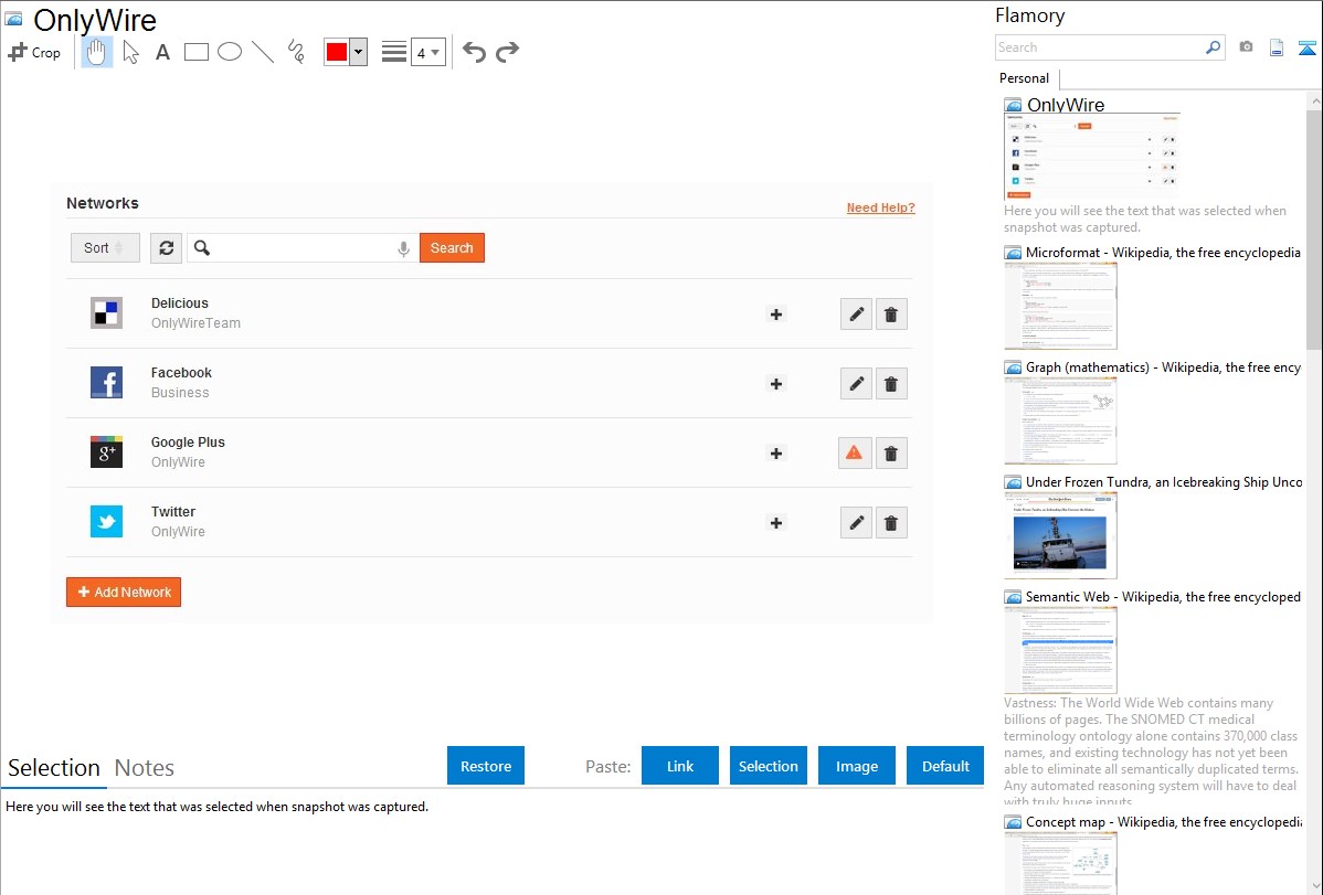 Flamory helps you capture and store screenshots from OnlyWire by pressing a single hotkey. It will be saved to a history, so you can continue doing your tasks without interruptions. Later, you can edit the screenshot: crop, resize, add labels and highlights. After that, you can paste the screenshot into any other document or e-mail message.