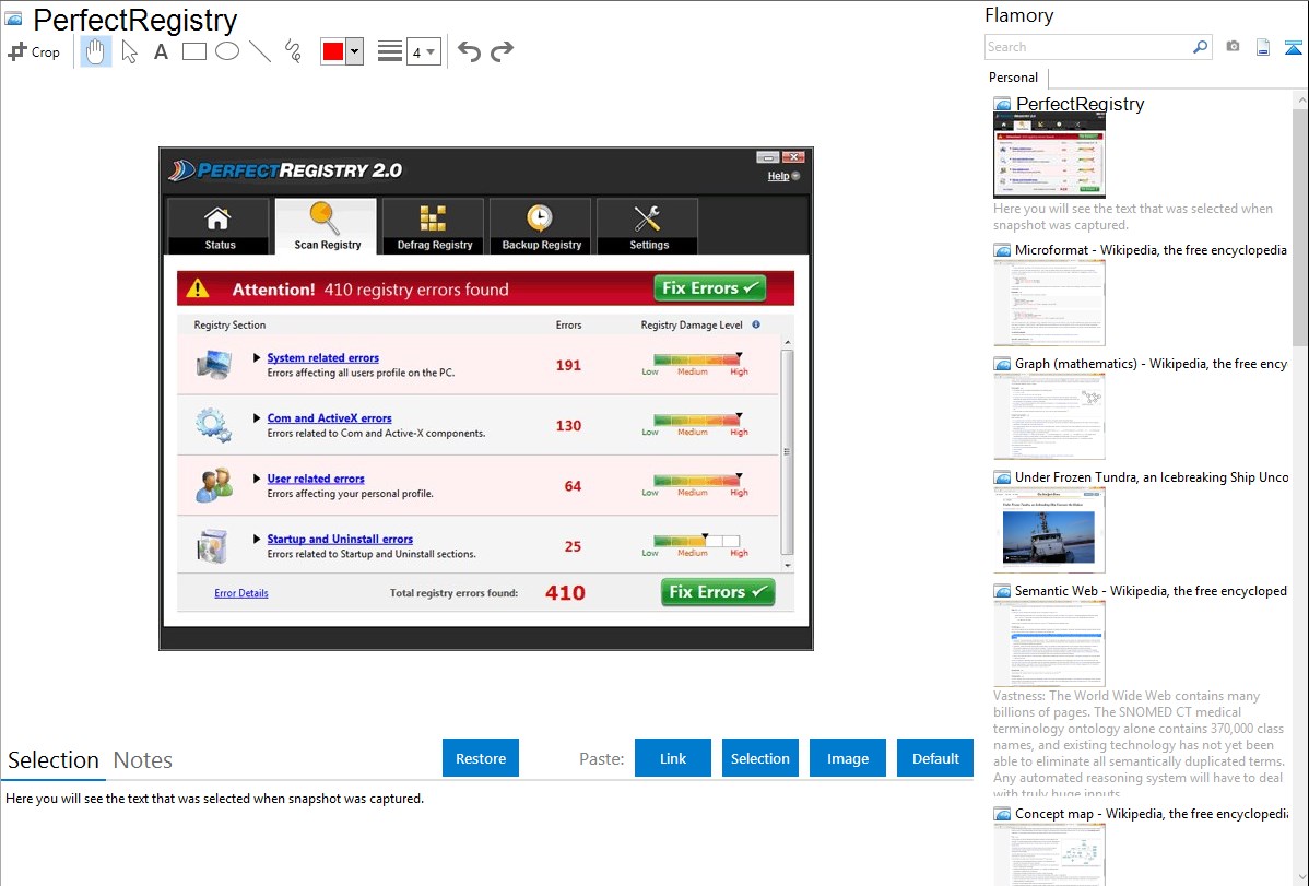 Flamory helps you capture and store screenshots from PerfectRegistry by pressing a single hotkey. It will be saved to a history, so you can continue doing your tasks without interruptions. Later, you can edit the screenshot: crop, resize, add labels and highlights. After that, you can paste the screenshot into any other document or e-mail message.