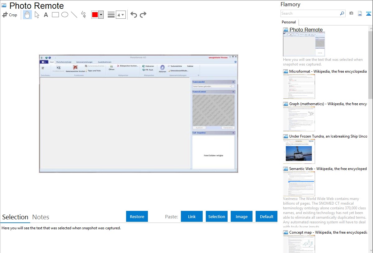 Flamory helps you capture and store screenshots from Photo Remote by pressing a single hotkey. It will be saved to a history, so you can continue doing your tasks without interruptions. Later, you can edit the screenshot: crop, resize, add labels and highlights. After that, you can paste the screenshot into any other document or e-mail message.