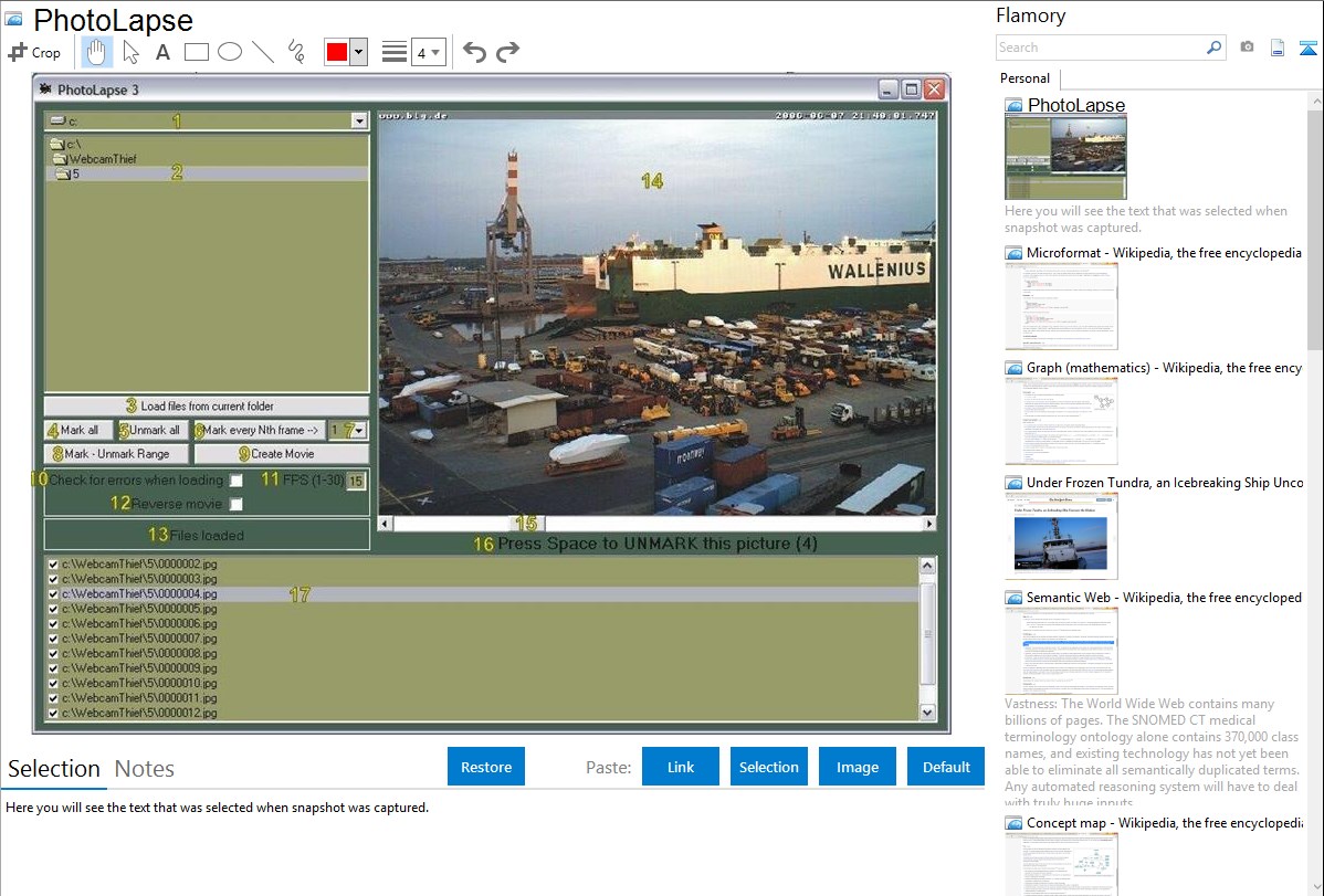 Flamory helps you capture and store screenshots from PhotoLapse by pressing a single hotkey. It will be saved to a history, so you can continue doing your tasks without interruptions. Later, you can edit the screenshot: crop, resize, add labels and highlights. After that, you can paste the screenshot into any other document or e-mail message.