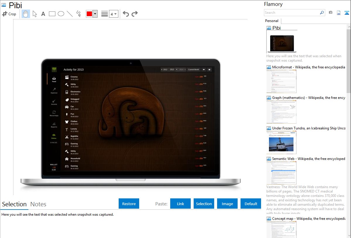 Flamory helps you capture and store screenshots from Pibi by pressing a single hotkey. It will be saved to a history, so you can continue doing your tasks without interruptions. Later, you can edit the screenshot: crop, resize, add labels and highlights. After that, you can paste the screenshot into any other document or e-mail message.