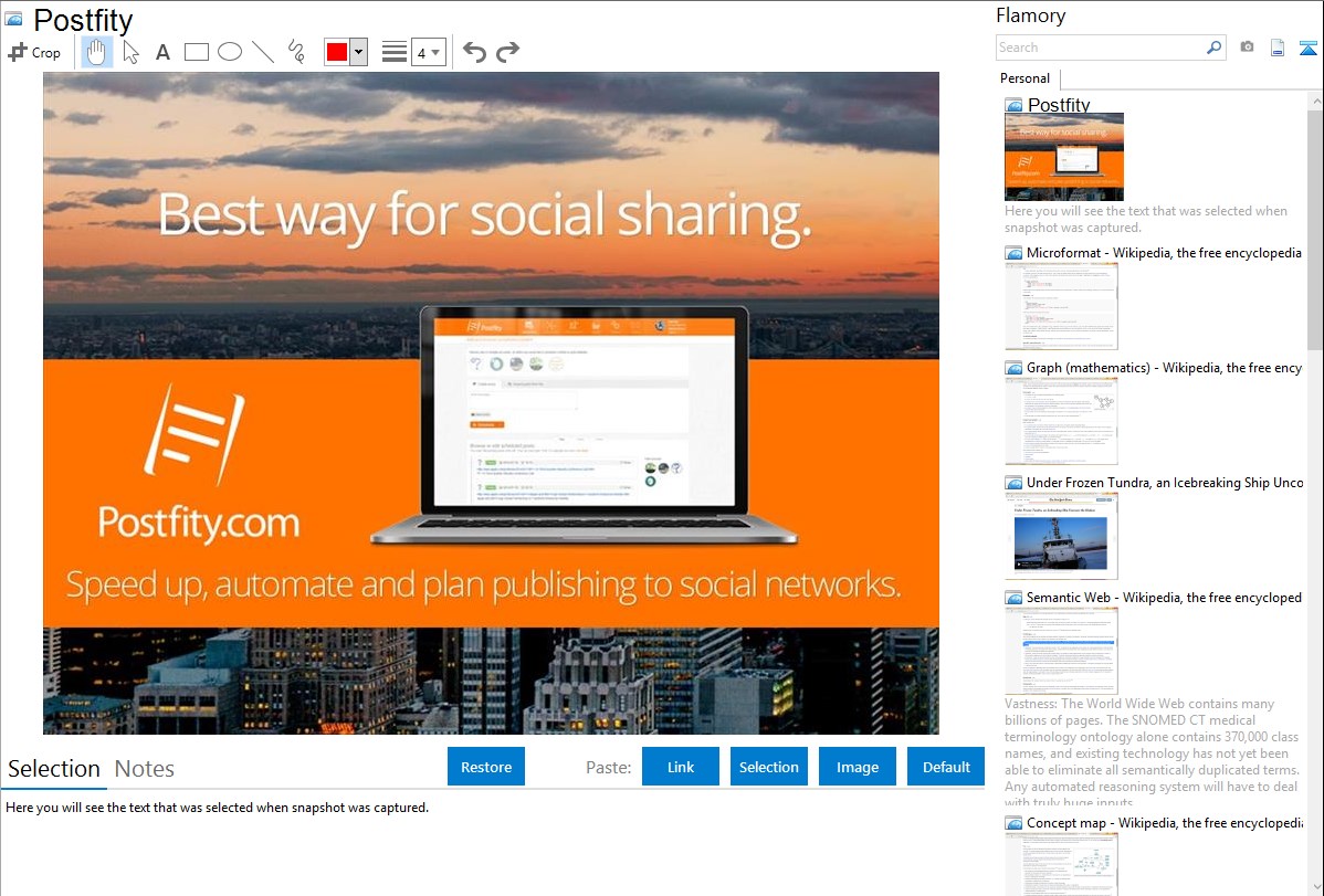 Flamory helps you capture and store screenshots from Postfity by pressing a single hotkey. It will be saved to a history, so you can continue doing your tasks without interruptions. Later, you can edit the screenshot: crop, resize, add labels and highlights. After that, you can paste the screenshot into any other document or e-mail message.