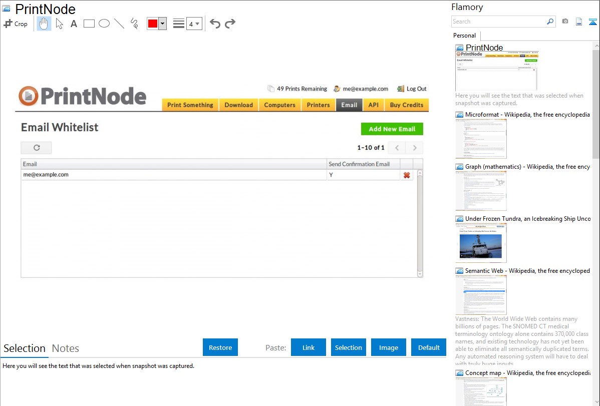 Flamory helps you capture and store screenshots from PrintNode by pressing a single hotkey. It will be saved to a history, so you can continue doing your tasks without interruptions. Later, you can edit the screenshot: crop, resize, add labels and highlights. After that, you can paste the screenshot into any other document or e-mail message.