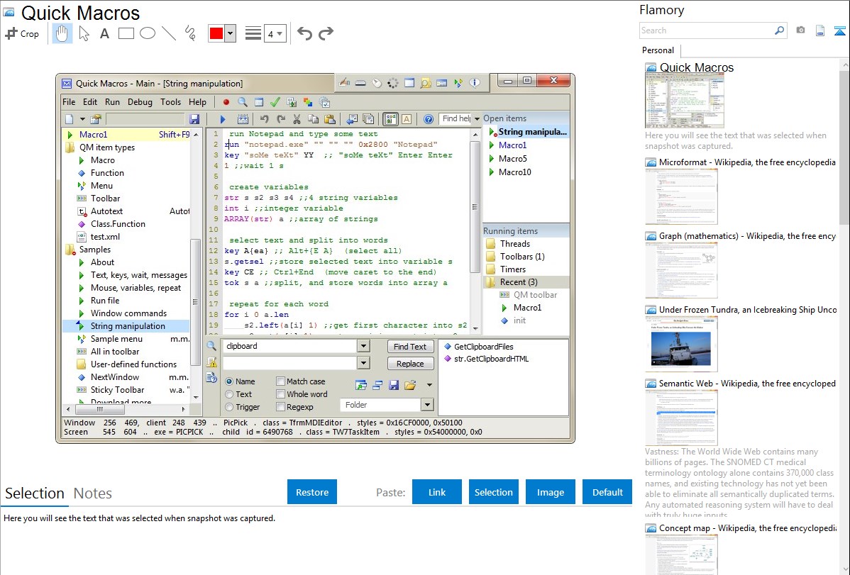 Flamory helps you capture and store screenshots from Quick Macros by pressing a single hotkey. It will be saved to a history, so you can continue doing your tasks without interruptions. Later, you can edit the screenshot: crop, resize, add labels and highlights. After that, you can paste the screenshot into any other document or e-mail message.