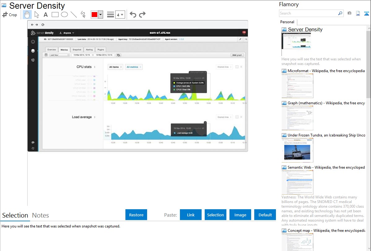 Flamory helps you capture and store screenshots from Server Density by pressing a single hotkey. It will be saved to a history, so you can continue doing your tasks without interruptions. Later, you can edit the screenshot: crop, resize, add labels and highlights. After that, you can paste the screenshot into any other document or e-mail message.