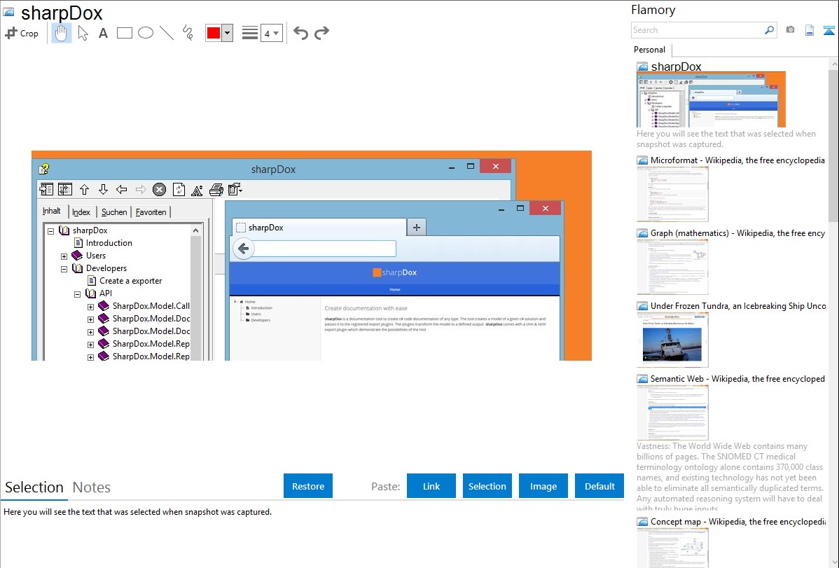 Flamory helps you capture and store screenshots from sharpDox by pressing a single hotkey. It will be saved to a history, so you can continue doing your tasks without interruptions. Later, you can edit the screenshot: crop, resize, add labels and highlights. After that, you can paste the screenshot into any other document or e-mail message.